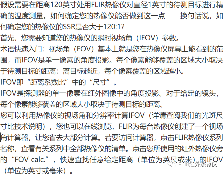 我們得到的距離系數(shù)比為120:0.31。簡而言之,0.31英寸大約為1英寸的1/3,因此該計算結(jié)果得出的結(jié)論就是:該熱像儀能夠在120英寸遠的距離測量1/3英寸的物體。