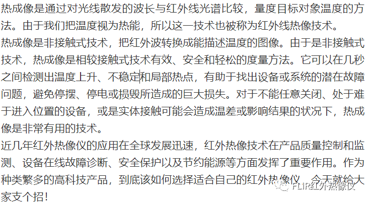 熱像儀的分辨率是熱像儀在工作中有多少像素。更高的分辨率意味著每個(gè)圖像包含更多的信息:更多的像素,意味著更多的細(xì)節(jié),因此獲得精確測(cè)量的可能性更大。選擇紅外熱像儀時(shí),取決于你的應(yīng)用:當(dāng)你能接近目標(biāo)時(shí),可以選擇低成本,低分辨率的相機(jī)。從更遠(yuǎn)的地方測(cè)量較小的目標(biāo)時(shí),則需要更高的分辨率。