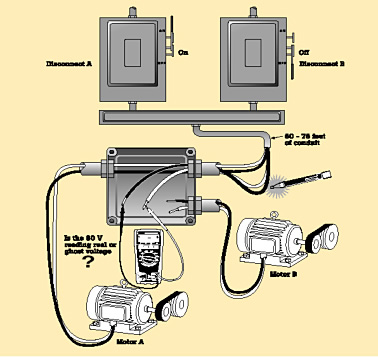 虛假電壓來自相互距離很近的通電電路和未通電導(dǎo)線(例如在同一個(gè)導(dǎo)線管或走線槽中)。這種情況可形成一個(gè)電容器,會(huì)在通電導(dǎo)線和相鄰的未使用導(dǎo)線之間產(chǎn)生電容耦合。
