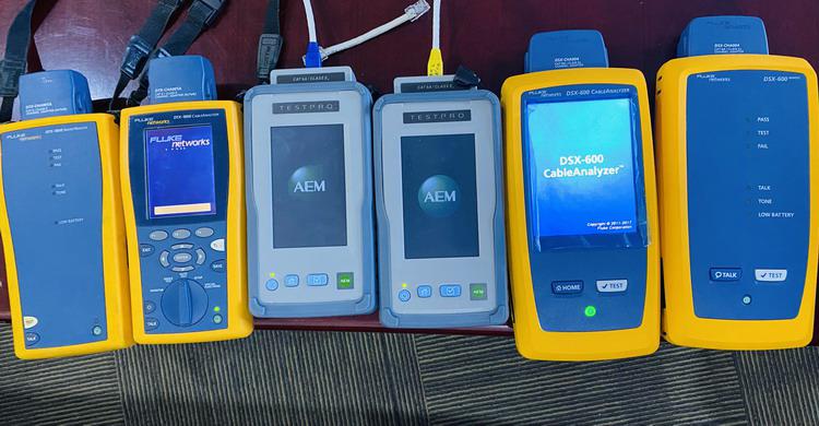 試驗(yàn)的首先,我們需要有一套AEM公司的CV-100的八類線測試主機(jī),配套的通道測試模塊,同時(shí)還必須有一套同等規(guī)格的福祿克DSX系列的測試儀,為了更容易獲得比較中立的測試結(jié)果,我們還多準(zhǔn)備了一套市場上普遍認(rèn)可的福祿克的DTX-1800測試儀;由于庫存機(jī)只有一套DSX-600新機(jī),暫且就以標(biāo)準(zhǔn)的六類線來見證測試結(jié)果。